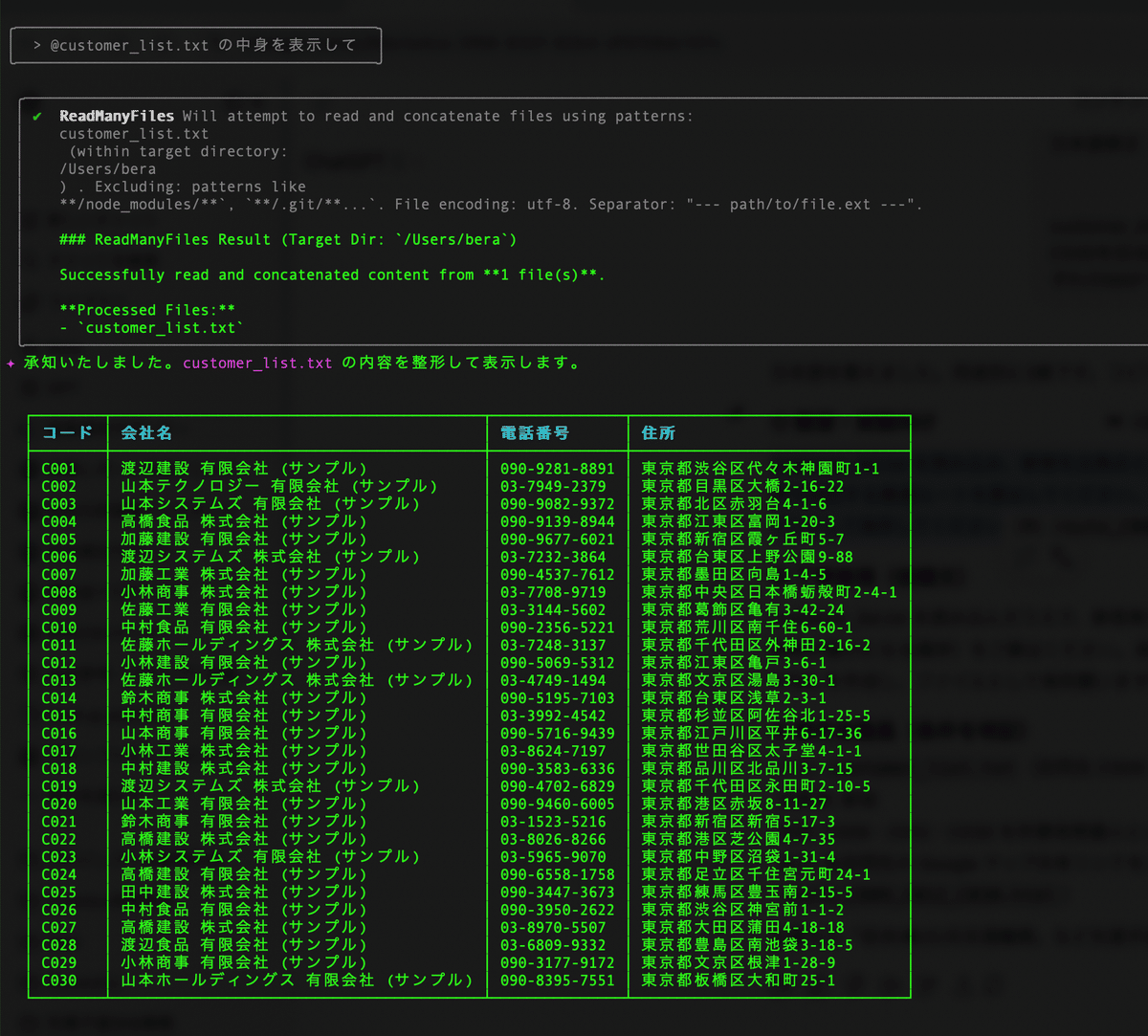【ヒント】コードがわからない場合: 会社コードや識別子がすぐにわからない場合は、Gemini CLIにリストを表示させることで確認できます。これにより、必要な情報を迅速に把握し、次のステップに進むことができます。