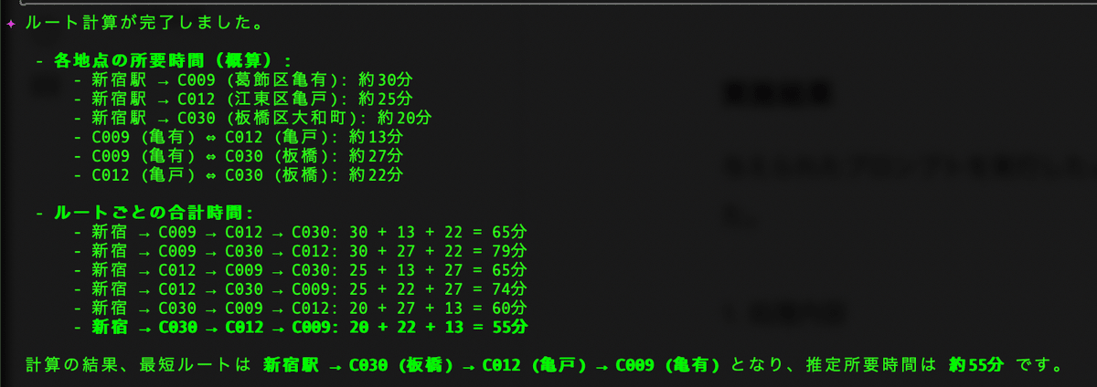 Gemini CLIに会社コードや識別子を入力すると、最適ルートを自動計算してGoogleマップリンクを生成できます。