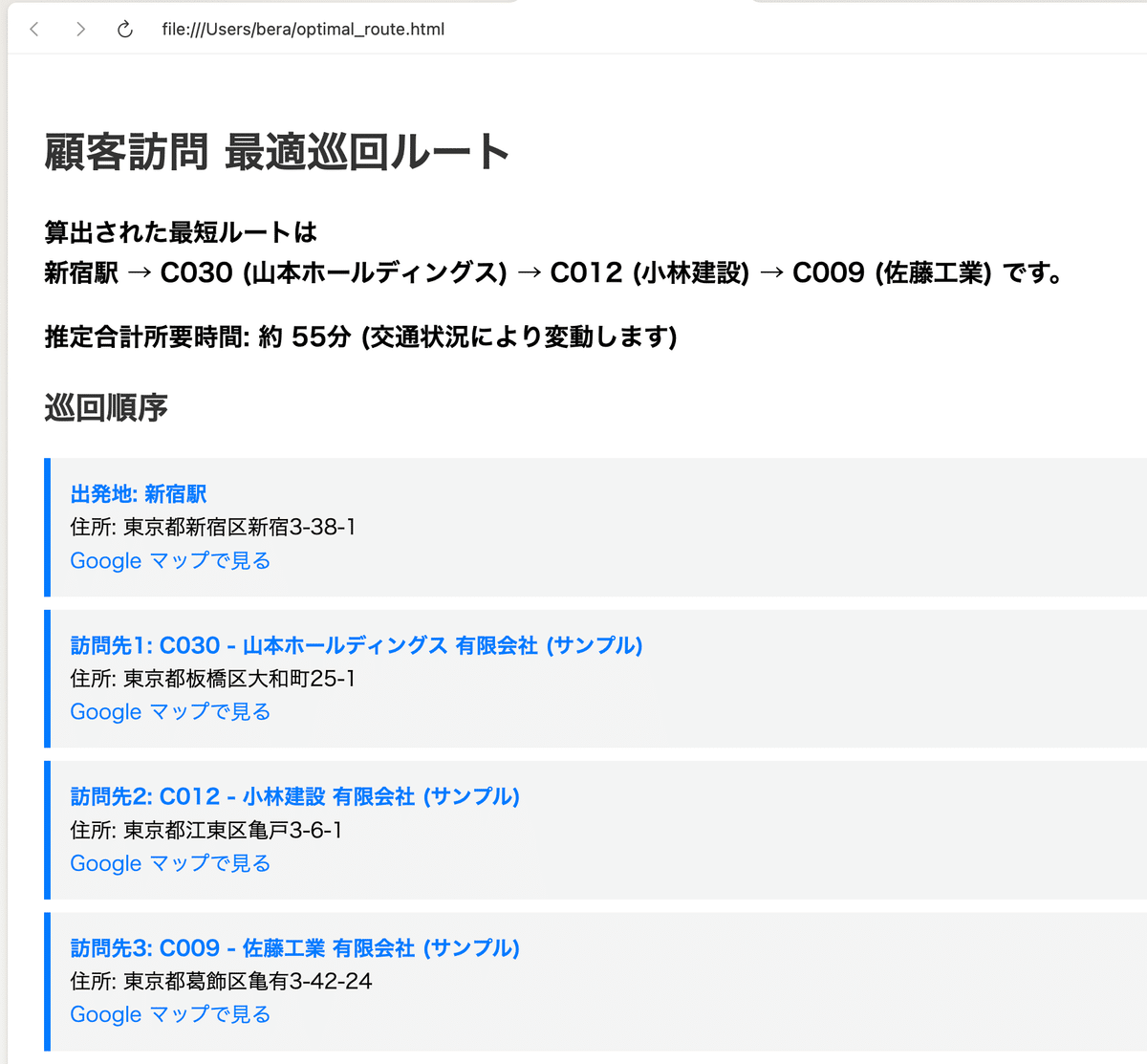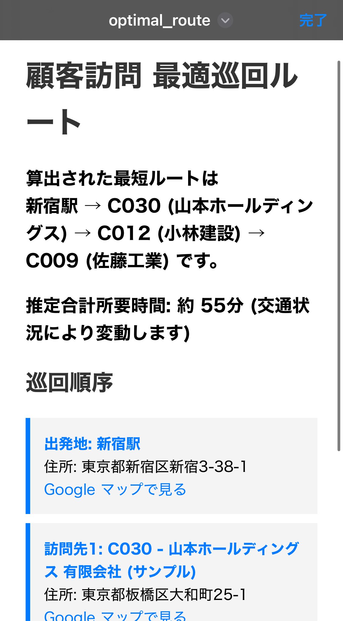 各訪問先には Google マップリンク を付与し、クリックするとすぐに経路確認が可能。