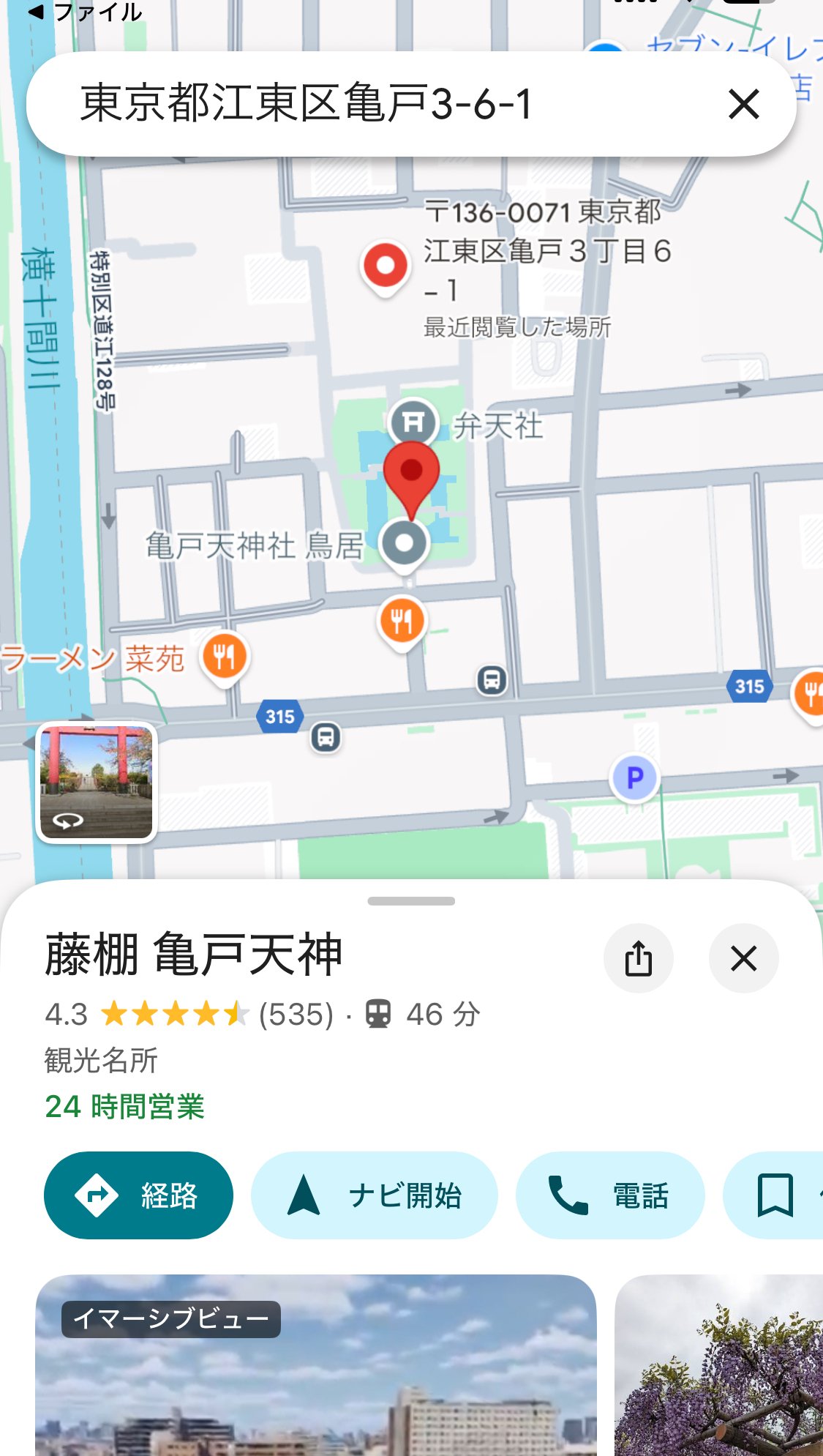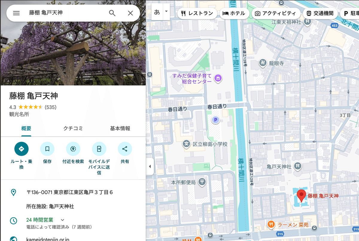 リンクをクリックすると指定住所をGoogleMap上で表示(今回は都内の神社を割り当ててみました)