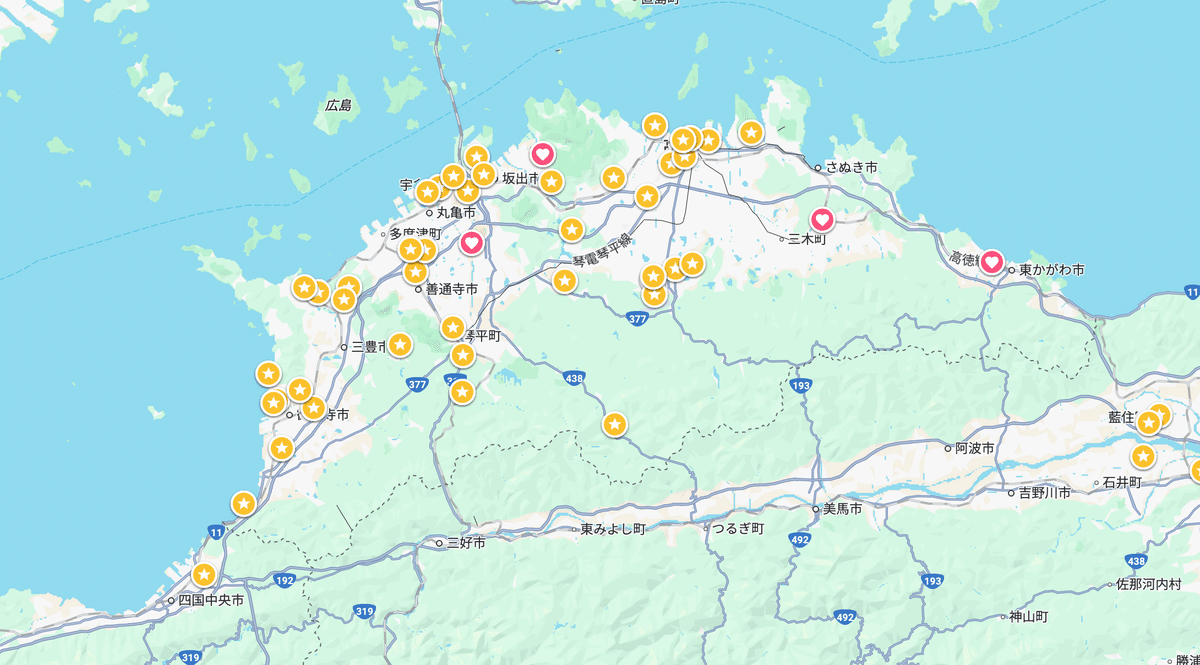 まず私のGoogleMap上の香川県は光輝いています。なぜなら、過去の出張時代に訪れたうどん屋がすべて保存されているから。
