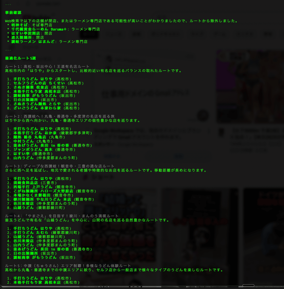 今回の舞台は香川県。私が過去に50店舗以上巡った讃岐うどんの名店を、今回は友人と一緒に効率よく回るためにGeminiをフル活用しました。