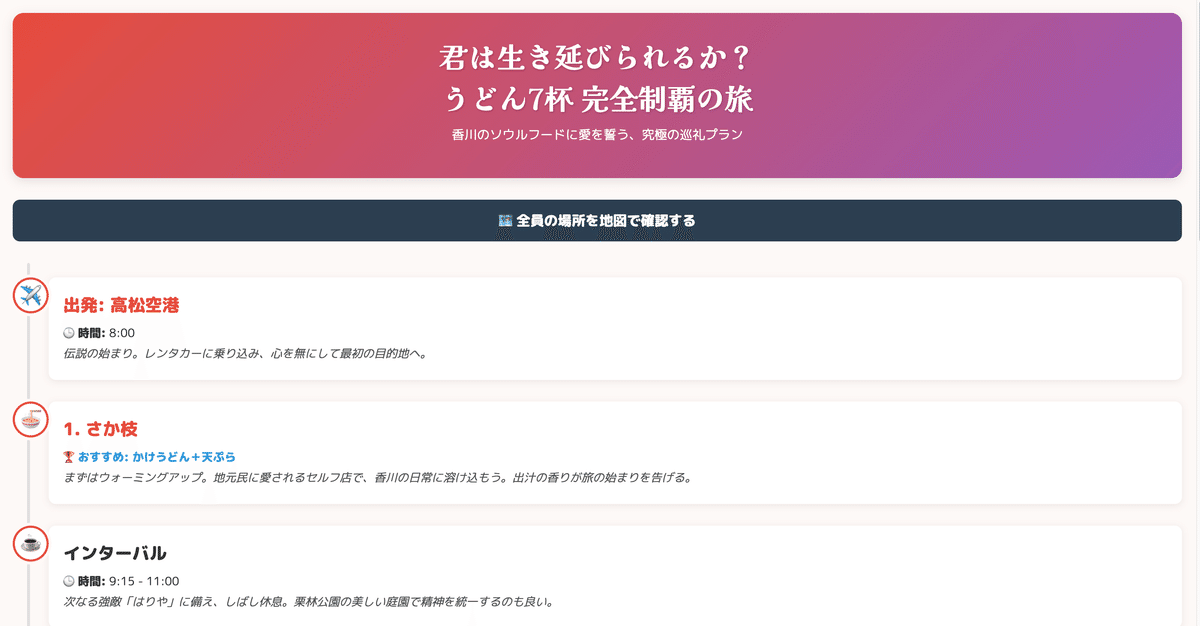 選定したコースをもとに、Geminiに依頼してHTMLファイルを作成。Google Maps APIと連携した、インタラクティブなマップが完成しました。