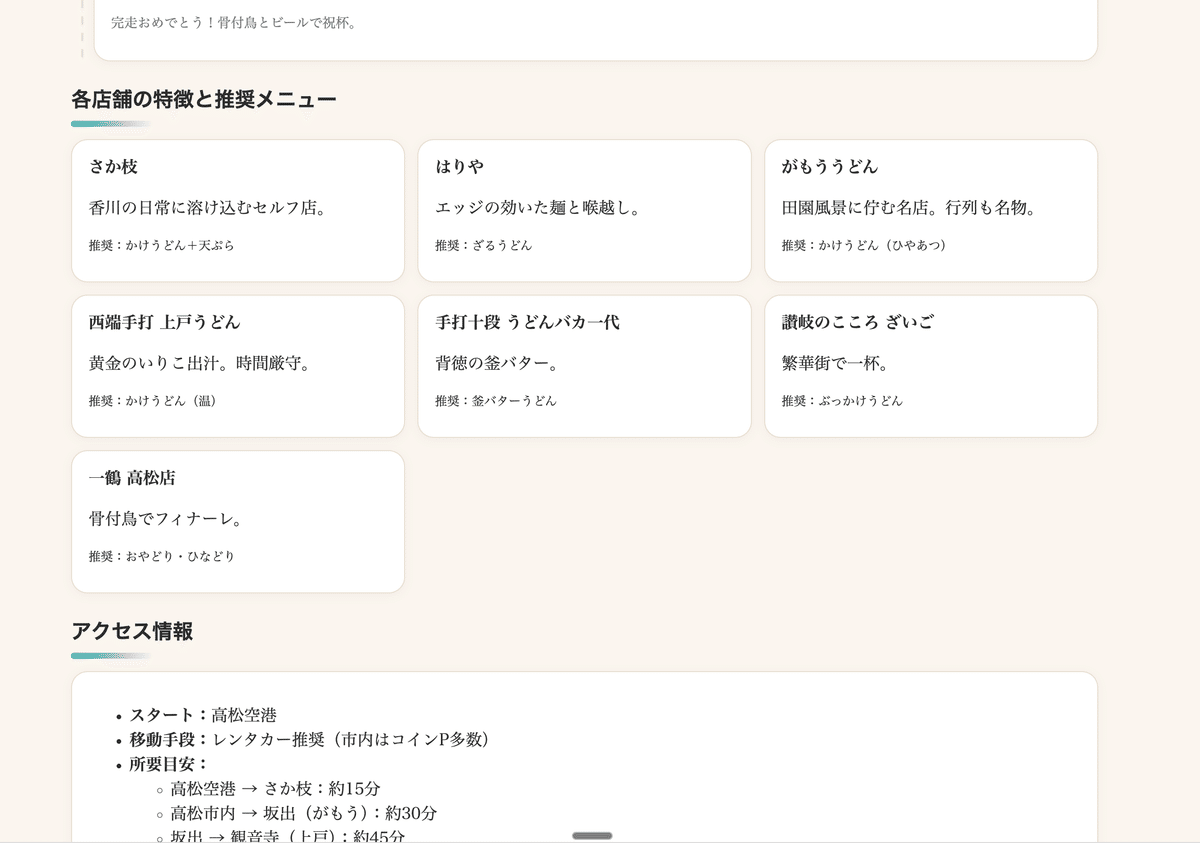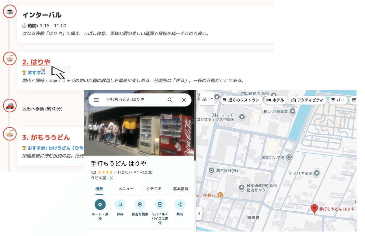 Geminiで作成した旅のしおりには、タイムスケジュールや各店舗の特徴とおすすめメニュー、さらに店名をクリックすればGoogleマップが起動するアクセス情報まで盛り込まれています。