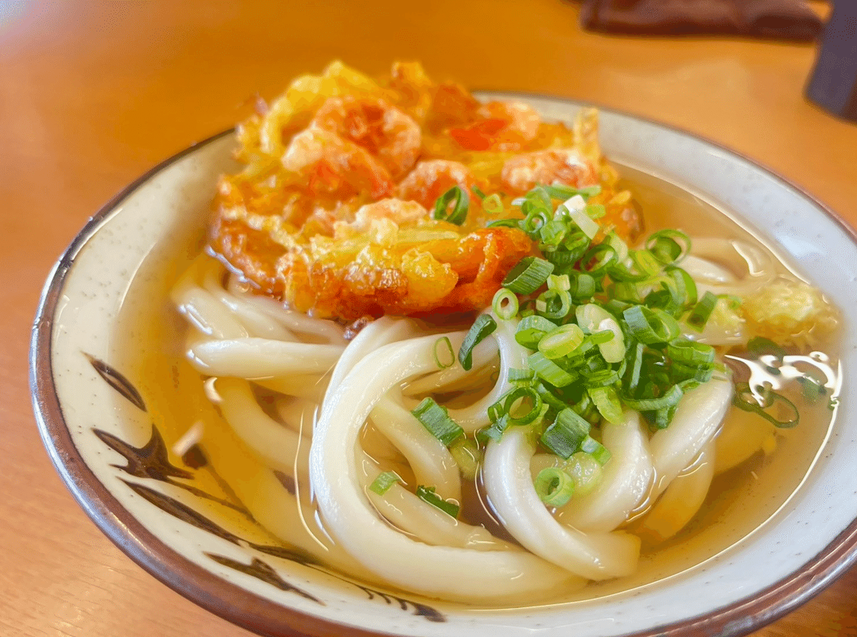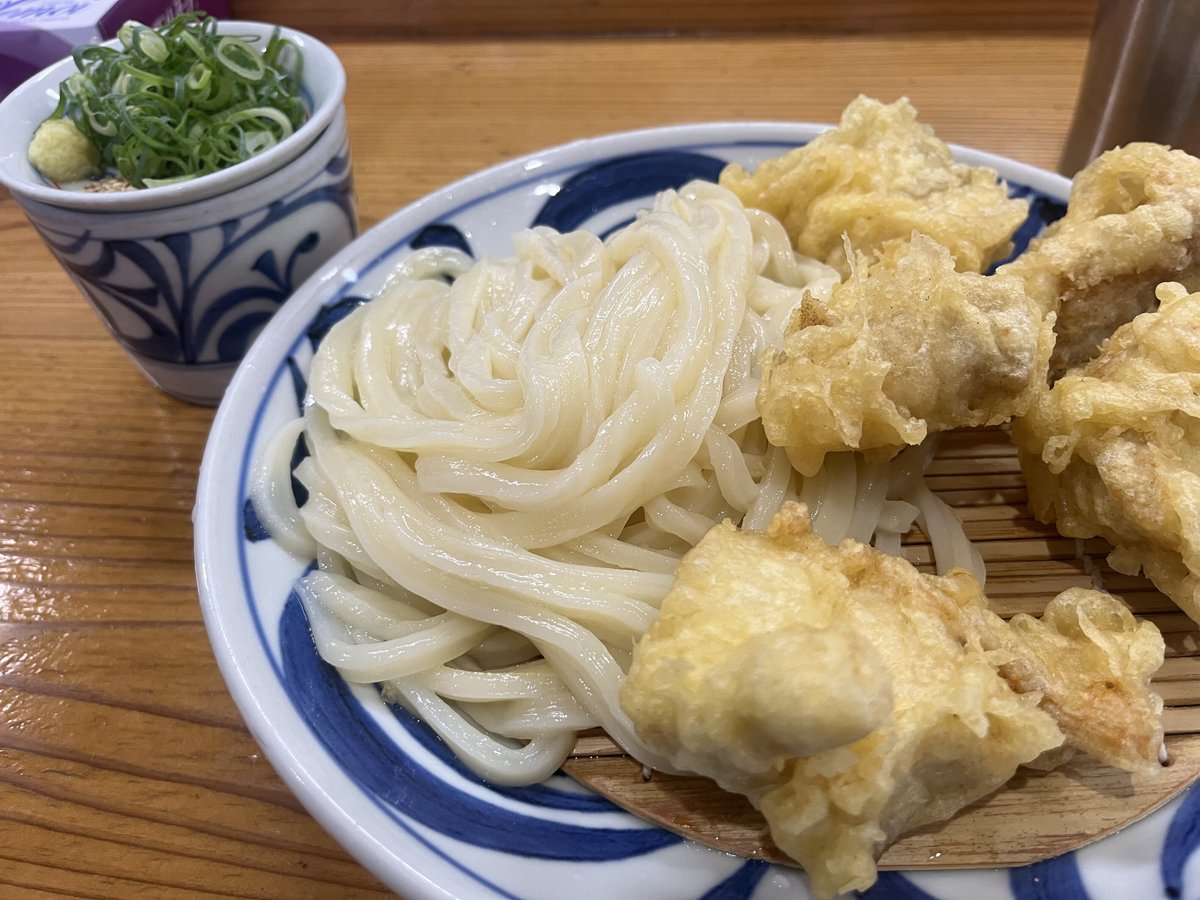 つるシコの麺とかしわ天、イカ天が最高。AIが提案した通り、朝一番で訪問したことで行列を避けることができました。