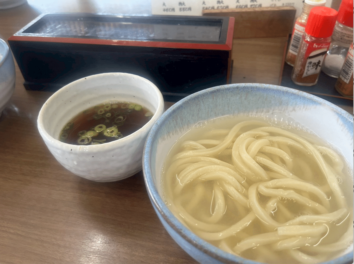 コシのある最高の麺とつけ汁。すこし濃いめのつゆにつけながら味わううどん。お母さんの明るい人柄に癒されました。
