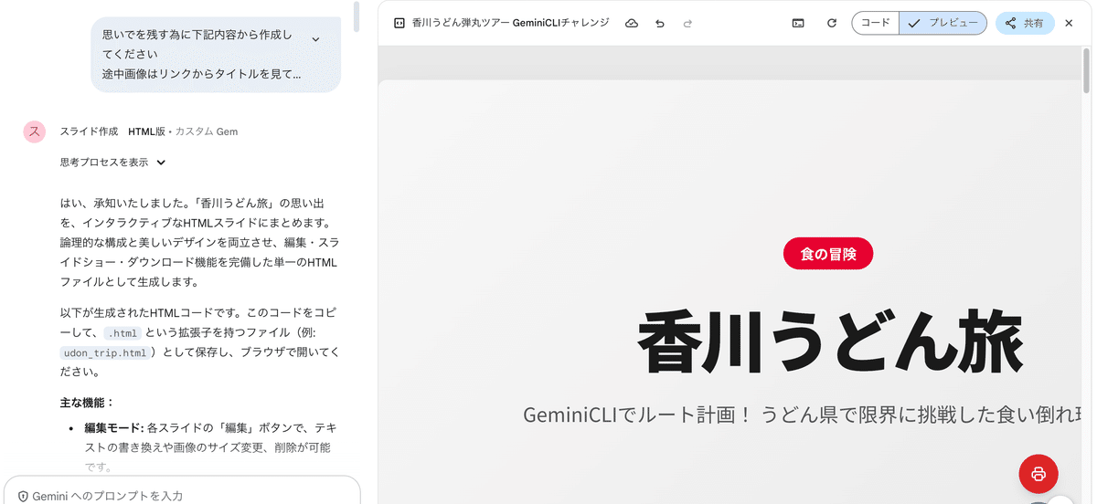 さらに、以前作っておいた「キーワードを渡すと資料を自動で作成してくれるGem」も試しに活用してみました。旅行に関連する思い出や体験を表すキーワードをいくつか投げてみたところ、あっという間に整理された素晴らしい資料が完成。まるで旅行記やアルバムの解説文のような仕上がりで、写真ブックとあわせて振り返ると一層楽しめる内容になりました。