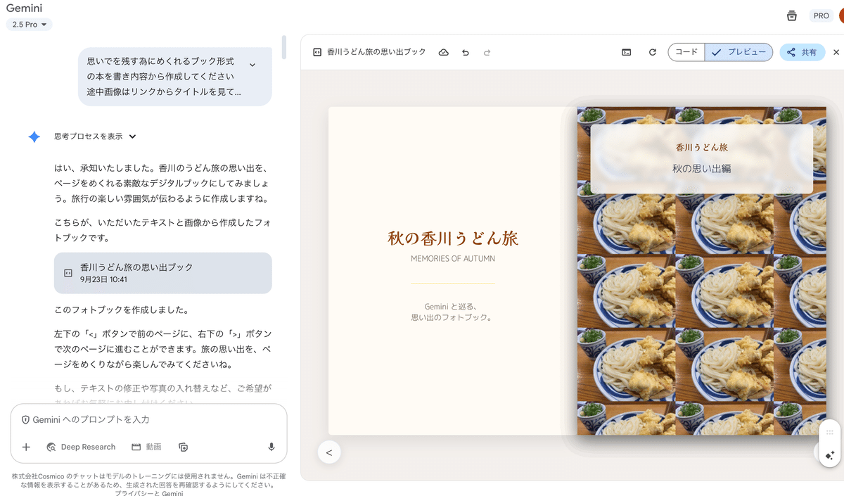 旅行の後、Geminiで思い出ブックを作成しました。簡単な指示をするだけで、プロ仕様のフォトブックデザインが完成します。私が行ったことは、載せたい写真を選び、画像管理サービス(Postimageを使用)にアップロードすることだけです。